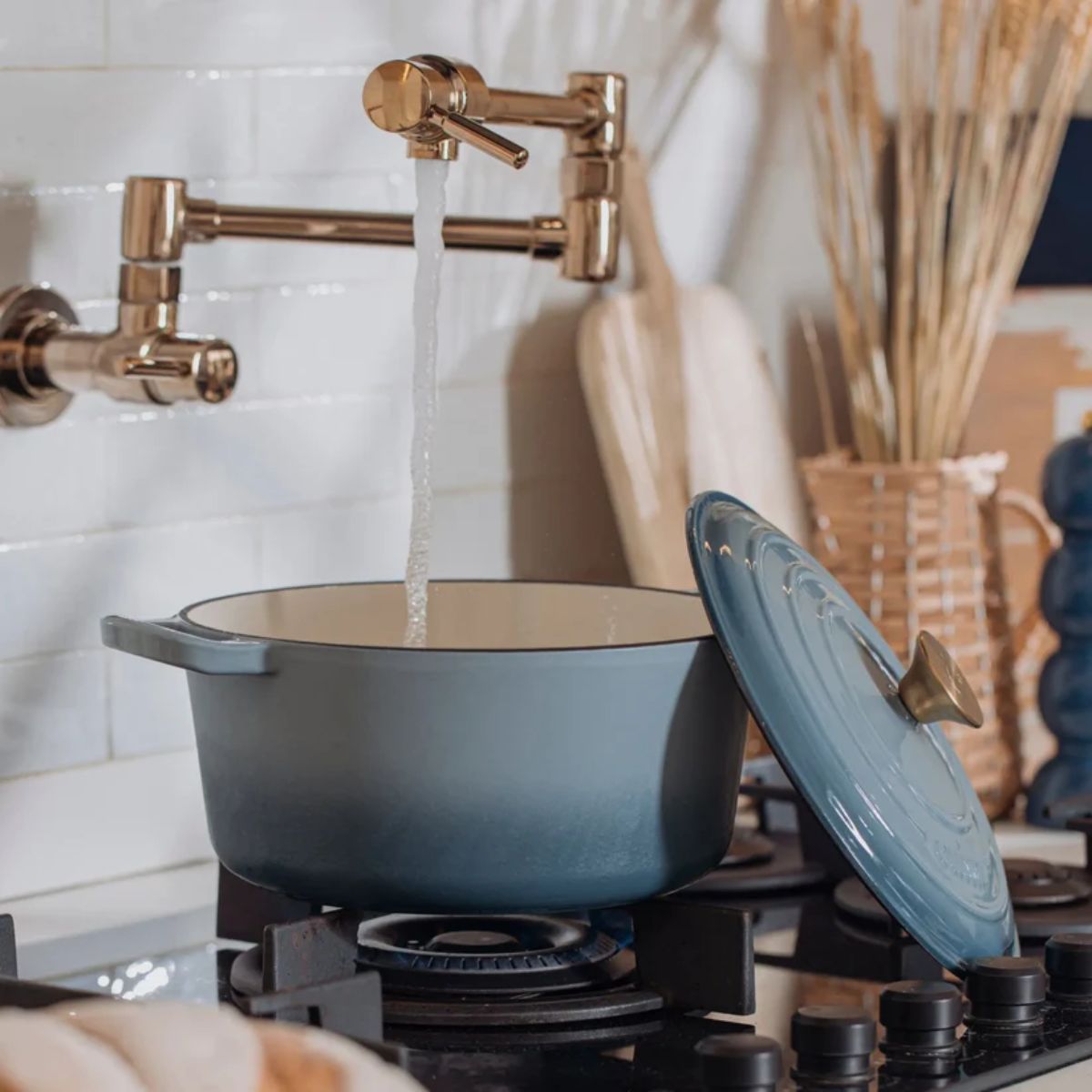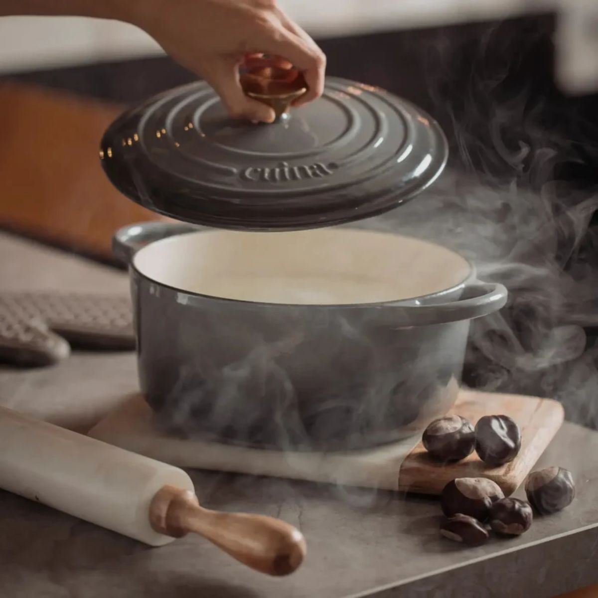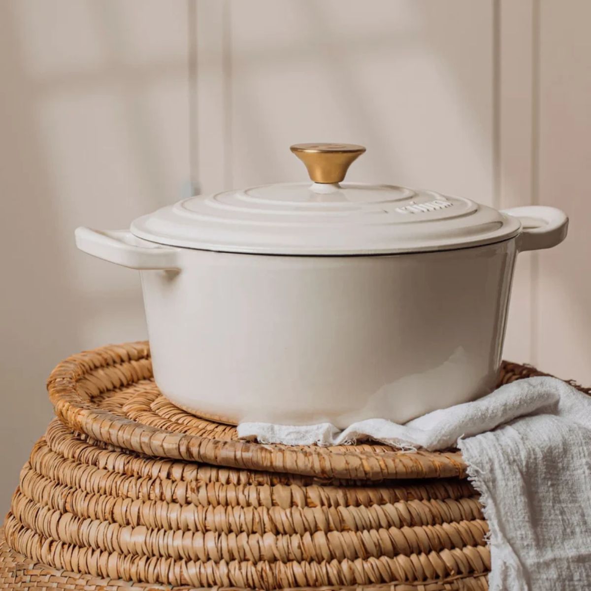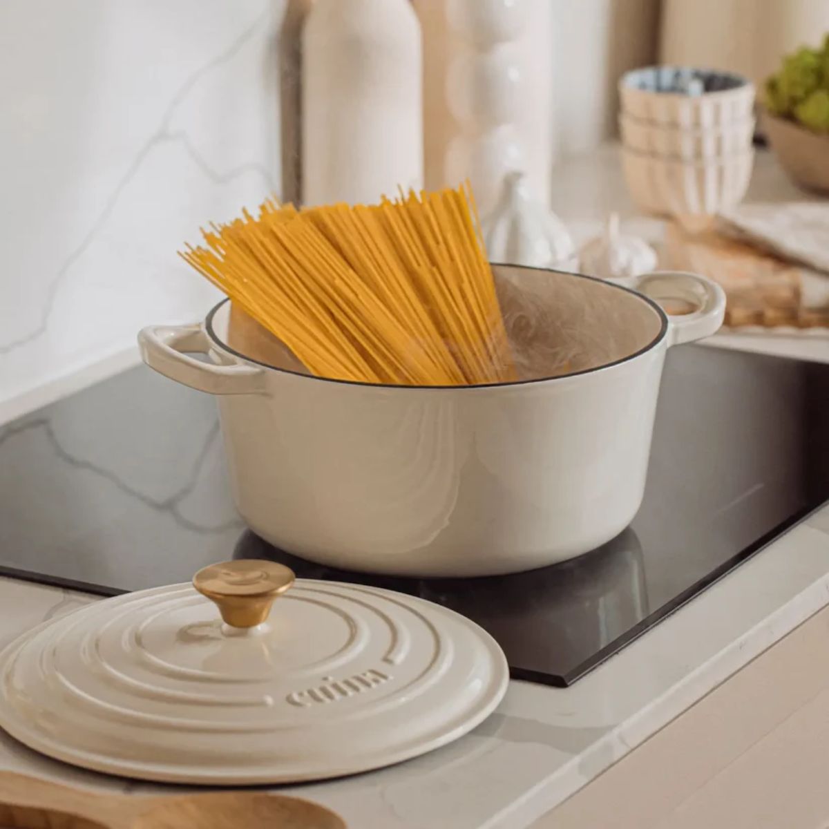 Su diseño atemporal con acabado en esmalte marfil e incrustaciones doradas aporta un toque elegante y sofisticado, perfecto para llevar directamente del fuego a la mesa. Además, es compatible con inducción, gas, vitrocerámica y horno, asegurando máxima versatilidad en tu cocina.