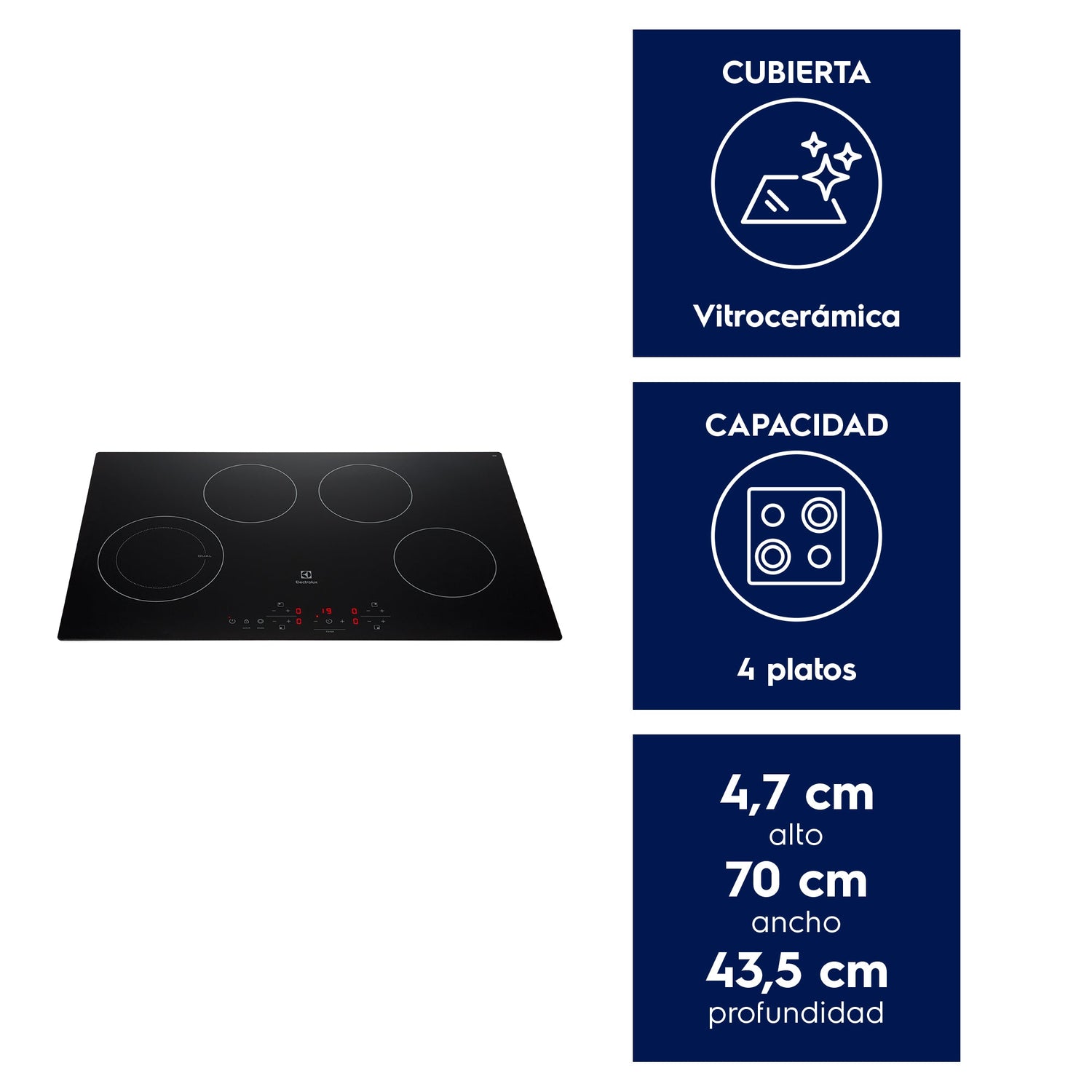 - 4 zonas radiantes (incluye una dual), ideal para cocinar múltiples platos simultáneamente
