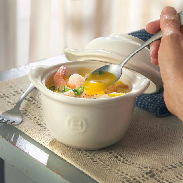 SERVIR / Un utensilio específico, el Egg Nest va directamente del horno a la mesa para servir caliente un huevo en cocotte o un huevo pasado por agua con una guarnición. Sus líneas suaves y su brillante esmaltado lo convierten en una atractiva pieza de vajilla.