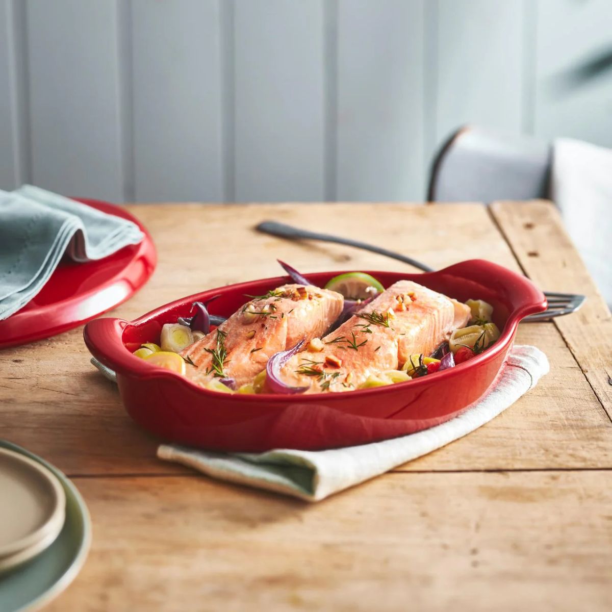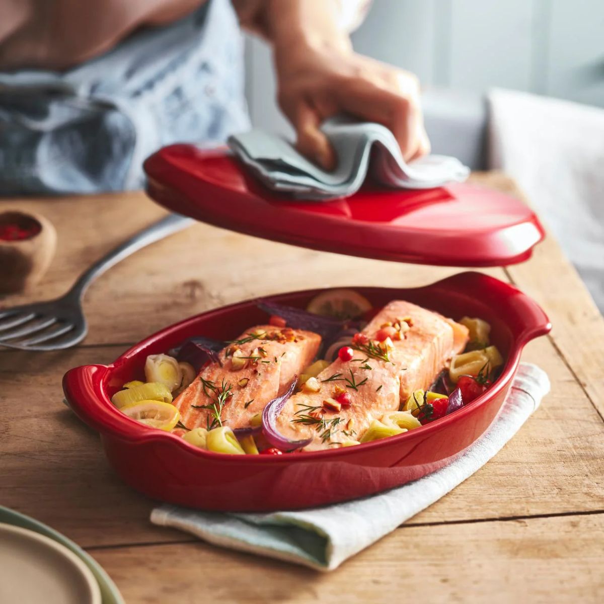 La fuente para horno «Papillote» de Emile Henry ofrece una forma sencilla y saludable de cocinar a la perfección todo tipo de verduras, pescados y carnes blancas, sin resecar su delicada carne.