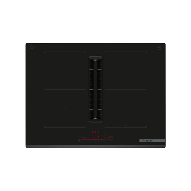 La placa de inducción Bosch PVQ731H26E Serie 6 integra un potente extractor directamente en la superficie de cocción, evitando la propagación de humos y olores en la cocina. Incorpora tecnología CombiInducción para unir zonas de cocción, control DirectSelect para un manejo rápido e intuitivo y sistema PerfectFry Plus que mantiene la temperatura ideal del aceite. Su extractor automático se activa al encender la placa, ofreciendo una solución eficiente, elegante y altamente funcional.