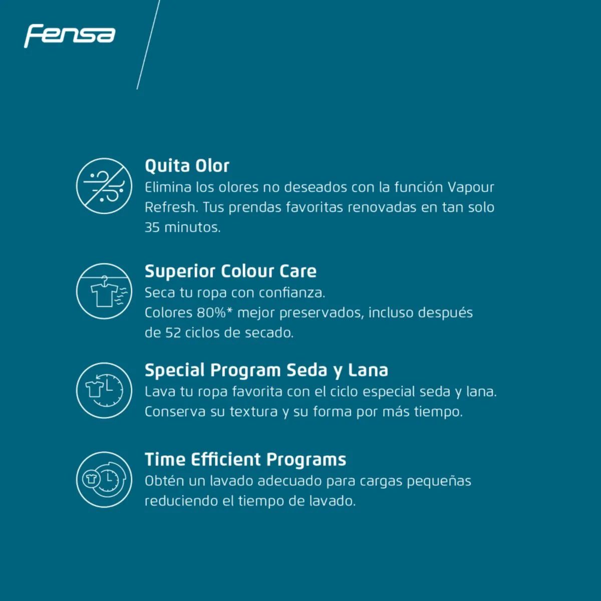 La Fensa Perfect Care 11WD combina lavado y secado en un solo equipo para optimizar tu espacio y simplificar tu día a día. Gracias a su sistema Steam Care reduce arrugas hasta en un 30% y cuida tus prendas con un acabado más suave, evitando el exceso de planchado.