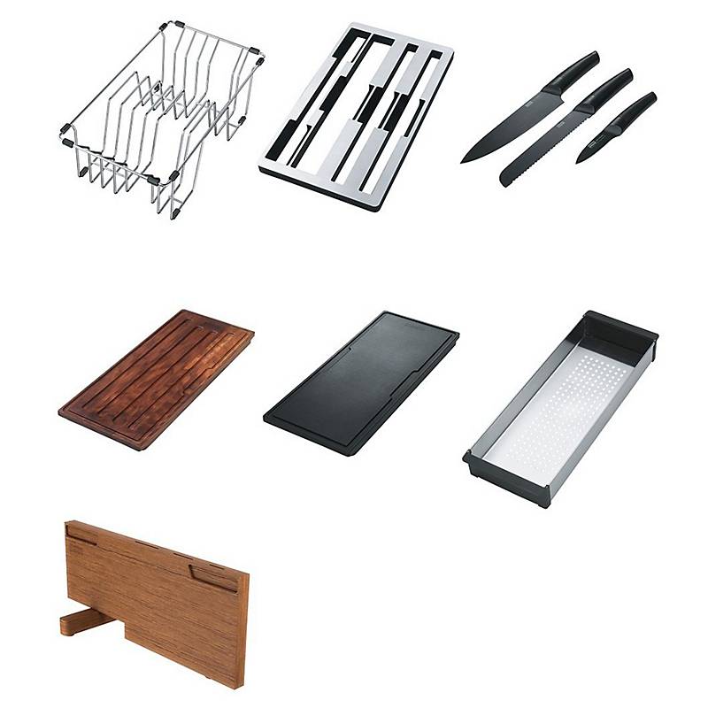 Incluye: Parrilla porta vajillas + Porta cuchillos + tabla de madera + bandeja escurridora + tabla de corte higiénica+ 3 cuchillos.