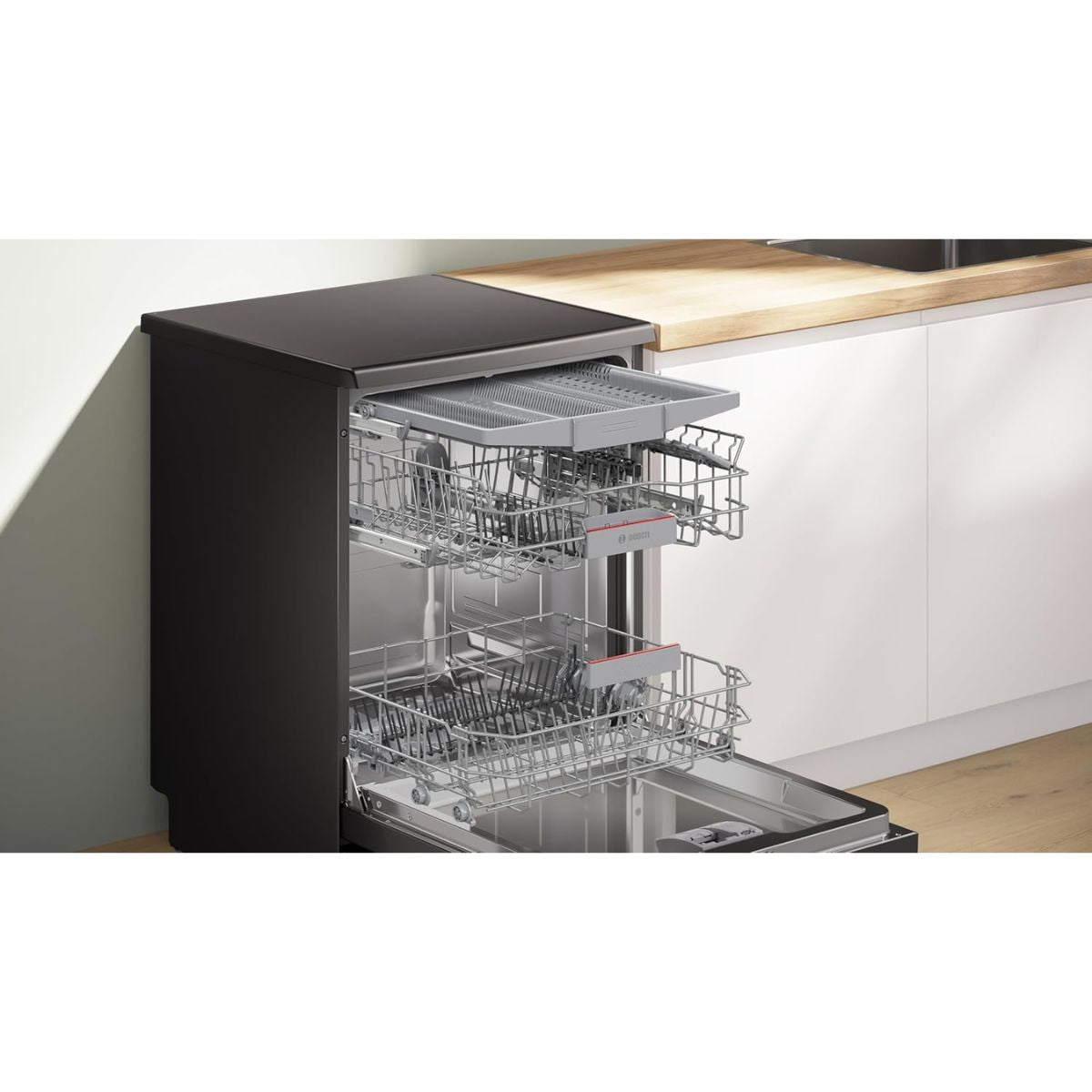 El lavavajillas Bosch Serie 4 modelo SMS4EMC06E ofrece una limpieza eficiente y silenciosa para el uso diario, con capacidad para 14 cubiertos y un diseño de libre instalación en acero negro cepillado antihuellas. Incorpora apertura automática de la puerta al finalizar el ciclo, mejorando el secado de forma natural y eficiente.