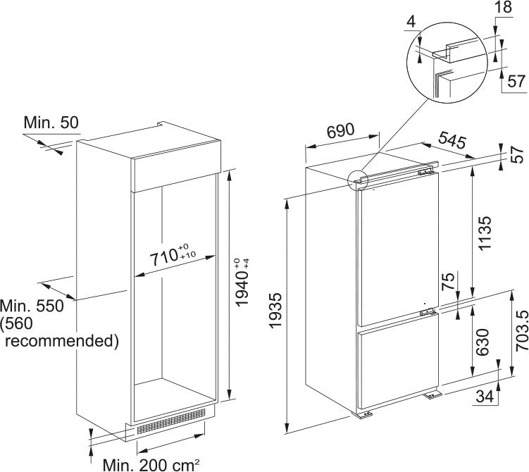 Sus dimensiones son 690 mm de ancho, 1935 mm de alto y 551 mm de profundidad, integrándose perfectamente en cualquier cocina.