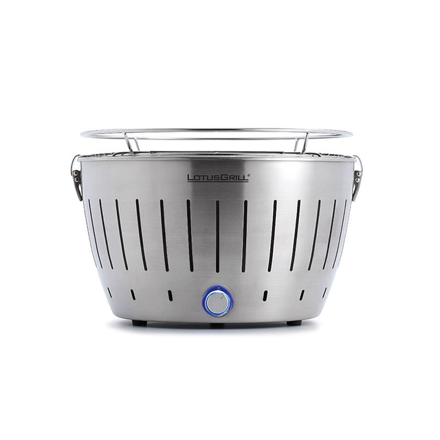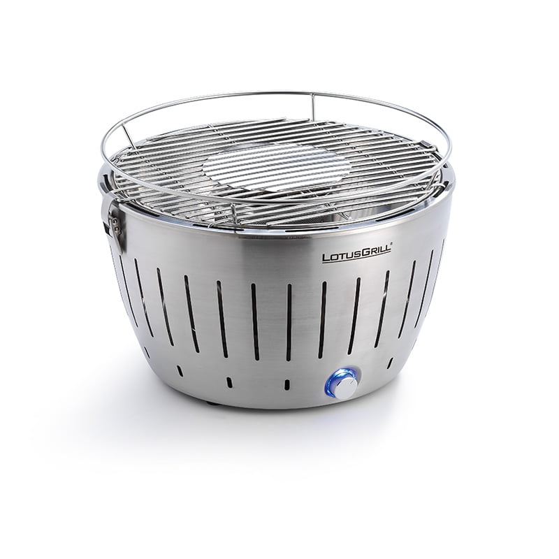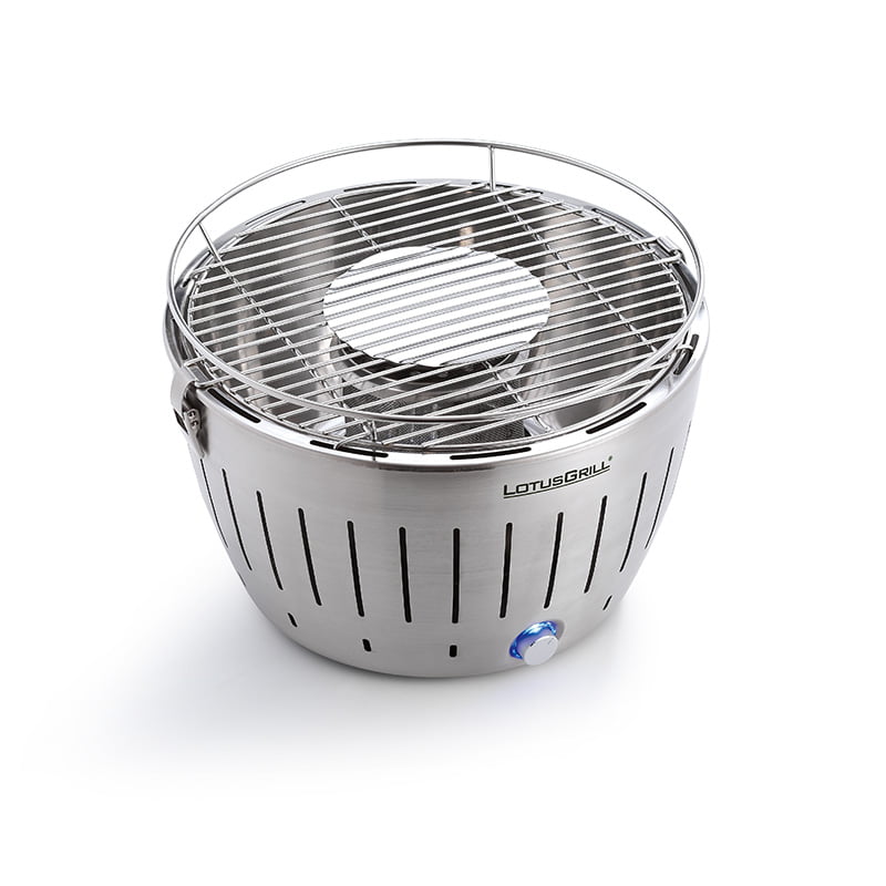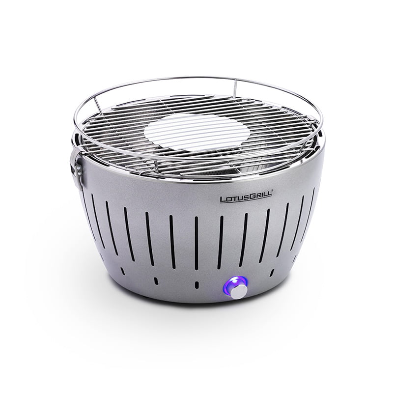El LotusGrill es redondo con una forma cónica hacia la base. Pesa menos de 4 kilos e incluye una bolsa de Nylon de color para su transporte. La parrilla del grill tiene un diámetro de 32 cms y es ideal para hasta 5 personas.