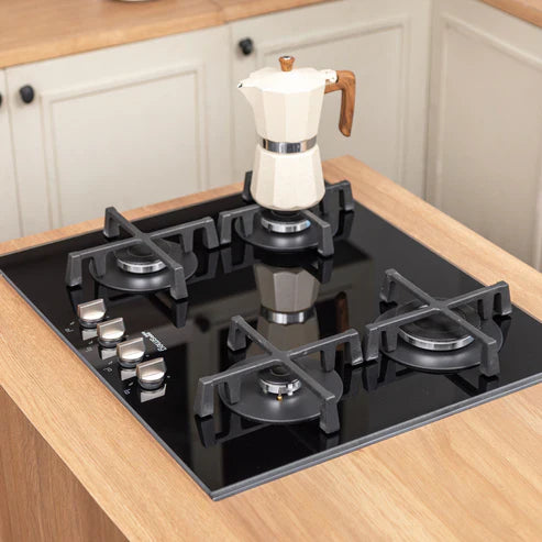 La Encimera a Gas 60 PV264N 4 quemadores de Smeg, de origen y diseño italiano, presenta un elegante cristal negro y parrillas de fierro fundido del mismo color. Equipado con cuatro quemadores de distintos tamaños y potencias, se adapta a variadas necesidades de cocción. Incluye un quemador ultra rápido para altas temperaturas, un quemador rápido para cocción rápida, un quemador semirápido para tareas diarias, y un quemador auxiliar para cocciones lentas y salsas. Esta encimera de gas mide 52 x 600 x 510 mm, ofreciendo versatilidad y estilo a la cocina.