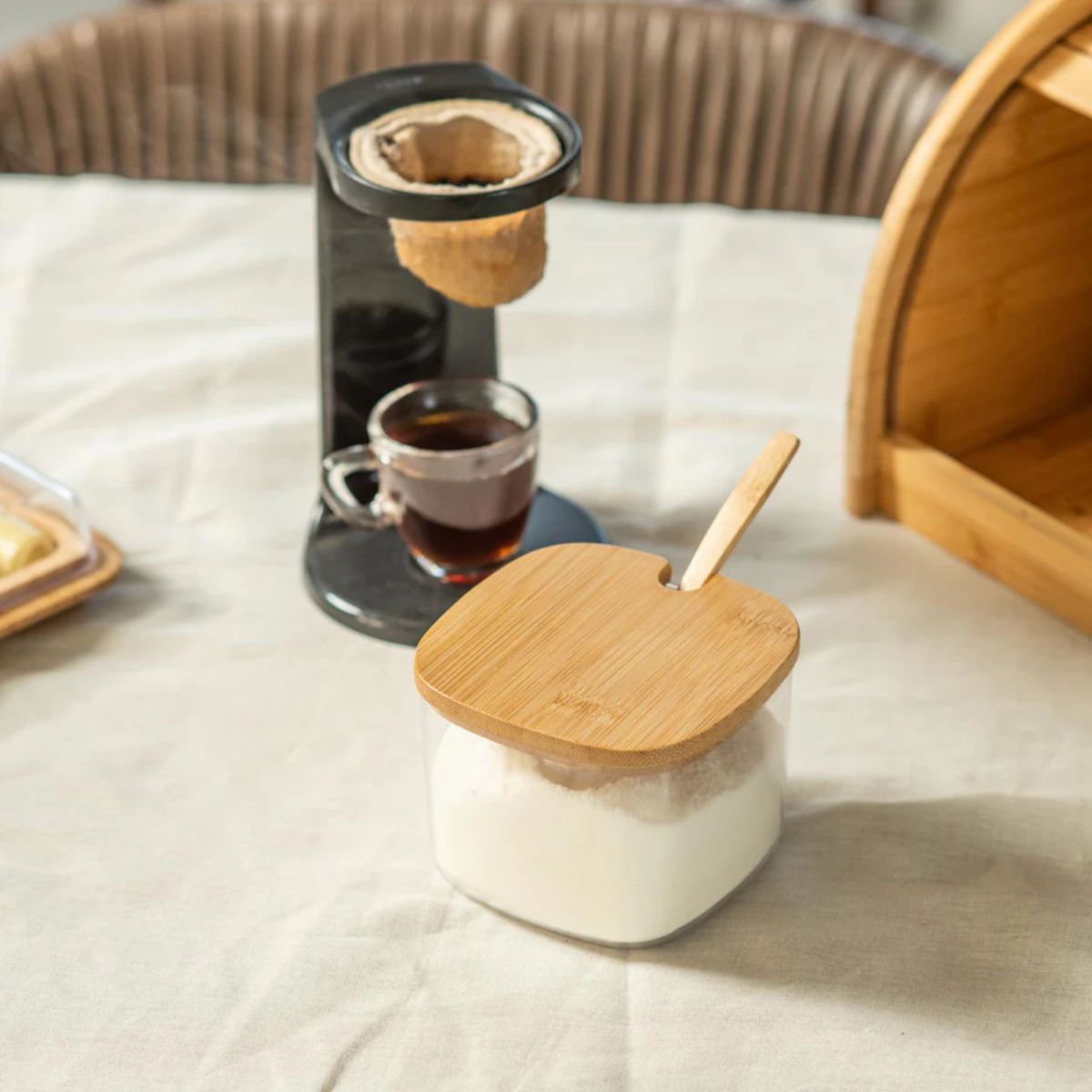 El azucarero de bambú transforma la experiencia de servir en la mesa, en una rutina con más comodidad y conexión con el hogar. La mezcla de materiales aporta funcionalidad y personalidad al ambiente. La tapa de bambú promueve la sostenibilidad de un material 100% renovable, y aporta sofisticación a la decoración de tu hogar.
