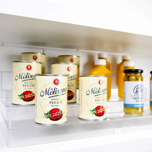 Diseño extensible: su ancho puede adaptarse según el espacio disponible, lo que permite un uso flexible en alacenas, estantes o repisas.